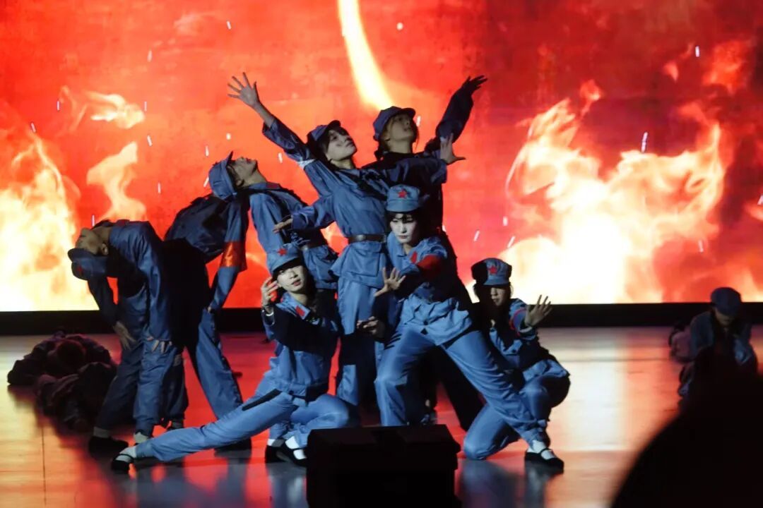 舞蹈作品《她在丛中笑》以战争年代为背景,用刚柔并济的舞姿勾勒出烽火岁月里的巾帼群像。舞者们时而以坚毅的姿态模拟战场冲锋的果敢,时而以轻柔的肢体诉说对和平的向往,将战争的残酷与生命的坚韧演绎得淋漓尽致。“她在丛中笑”的意象贯穿始终,既是对革命先辈在苦难中坚守信仰的致敬,也展现出新时代青年对英雄精神的传承与弘扬。