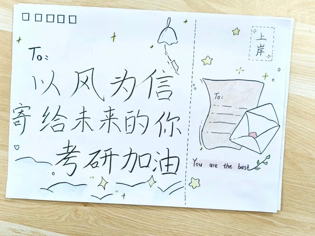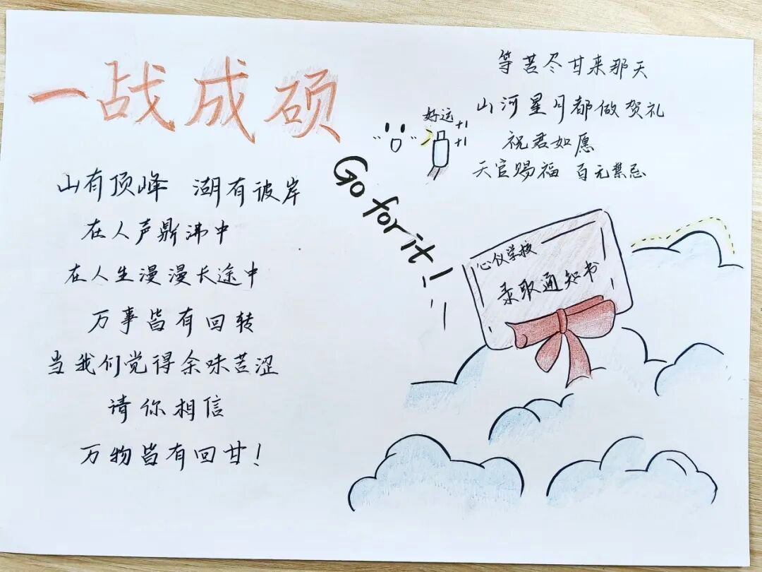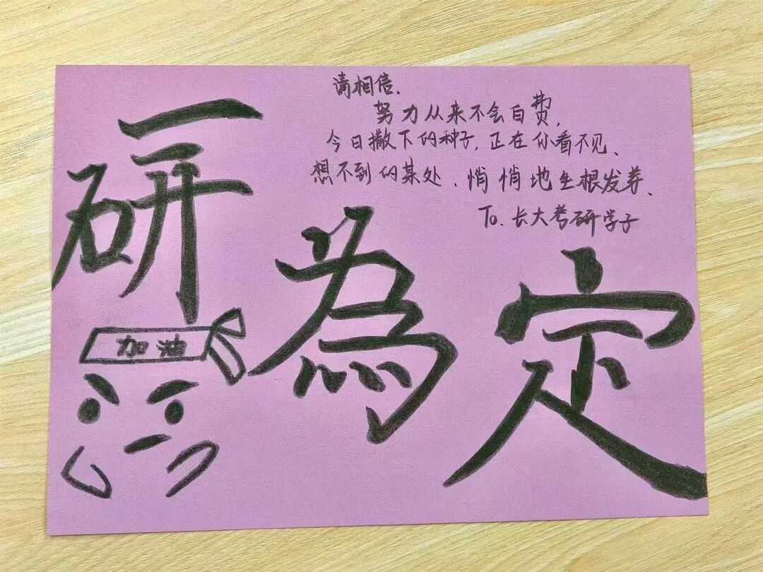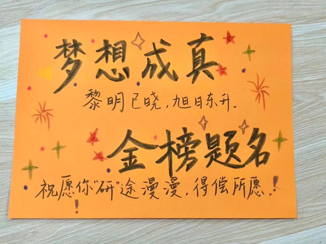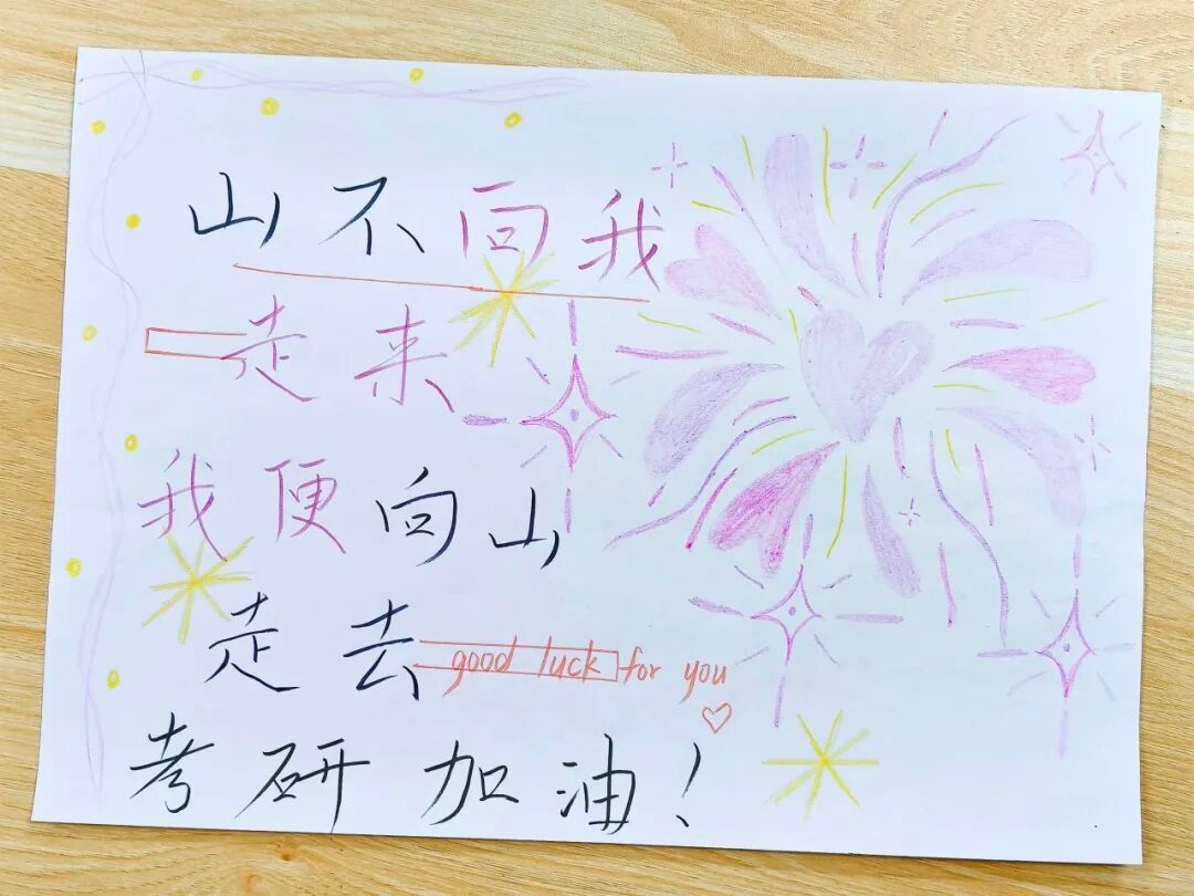 学弟学妹们用画笔定格敬意,每一张手绘海报都藏着巧思:有的绘着“一战成硕”的锦鲤,有的写着“笔锋所至,梦想开花”的寄语,拍照定格后,每一帧都是青春的呐喊与支持~